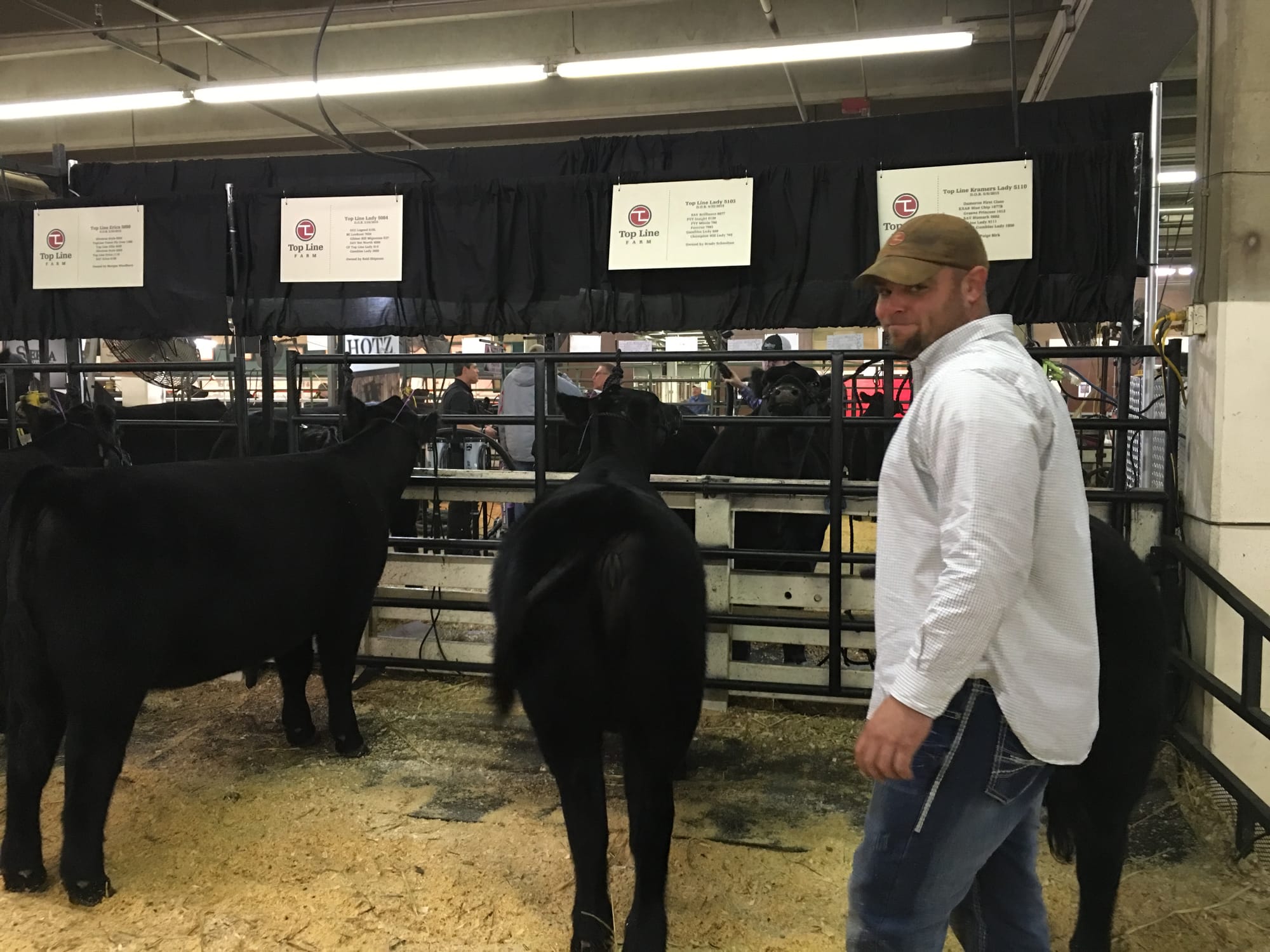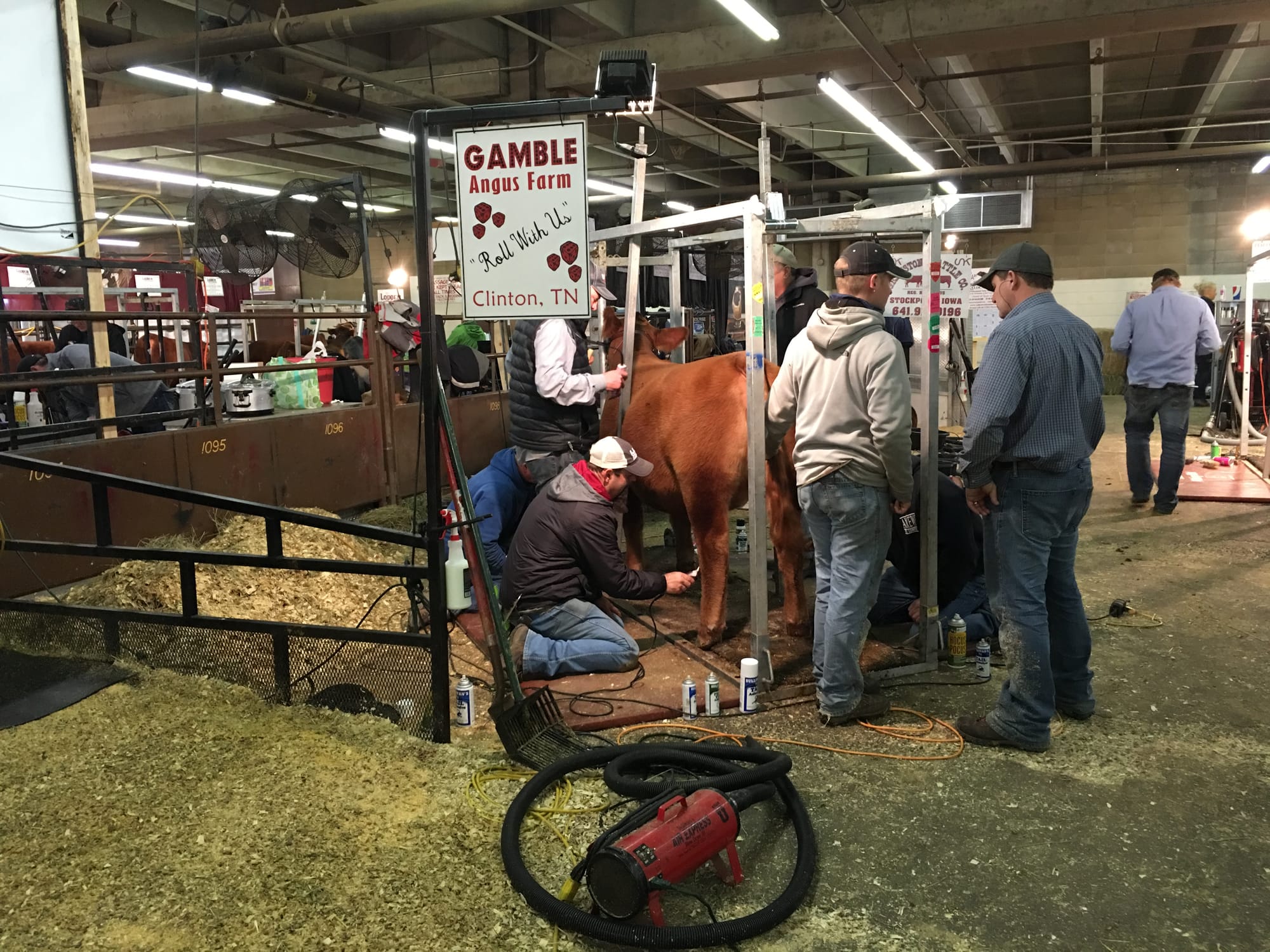 Next we headed to what I would call the staging area. This is where each farm has stalls and they house their animals there throughout the competition. The space is a ginormous warehouse with a lowish roof, about 1 story, full of cows! The floor is covered in straw, but you need to have on boots that can be cleaned to walk around in here! Each farm, is set up into their own area/sort of an open air pen, with "walk ways" between them, so you can walk up and down the stalls and inspect all the competition if you want to, These open pens house the cows waiting to compete. In the pens, each farm has teams of people, busy blow drying a heifer or two, while someone else is hairspraying a tail, another person is licking their fingers to flatten a cowlick, on a cow! This is serious business!